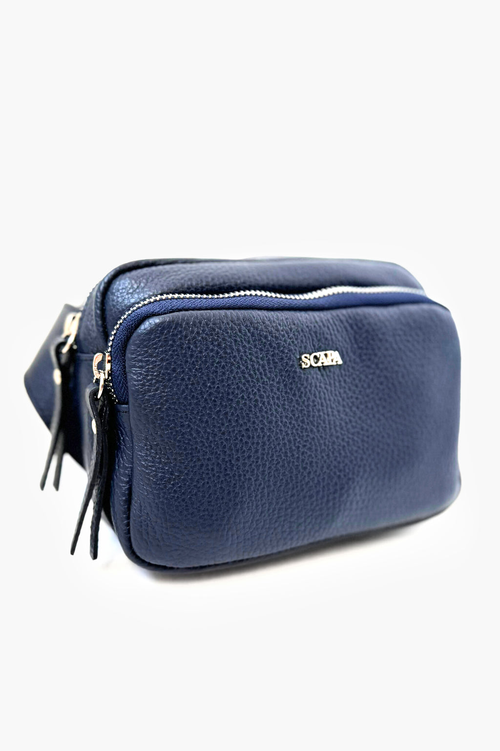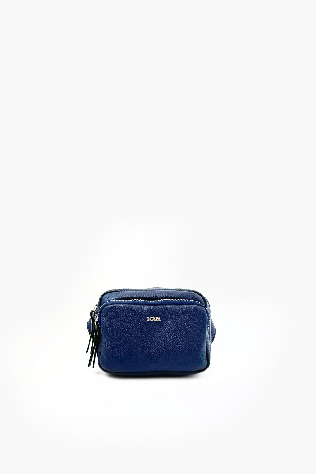 This SCAPA belt bag combines functionality with a sleek, modern design. Made from high-quality black textured leather, it features two gold zip compartments, providing ample space for essentials like a phone, wallet, and keys while keeping them secure and organized. The gold zippers add a touch of elegance to the minimalist look, making it a versatile accessory that easily complements both casual and dressy outfits.