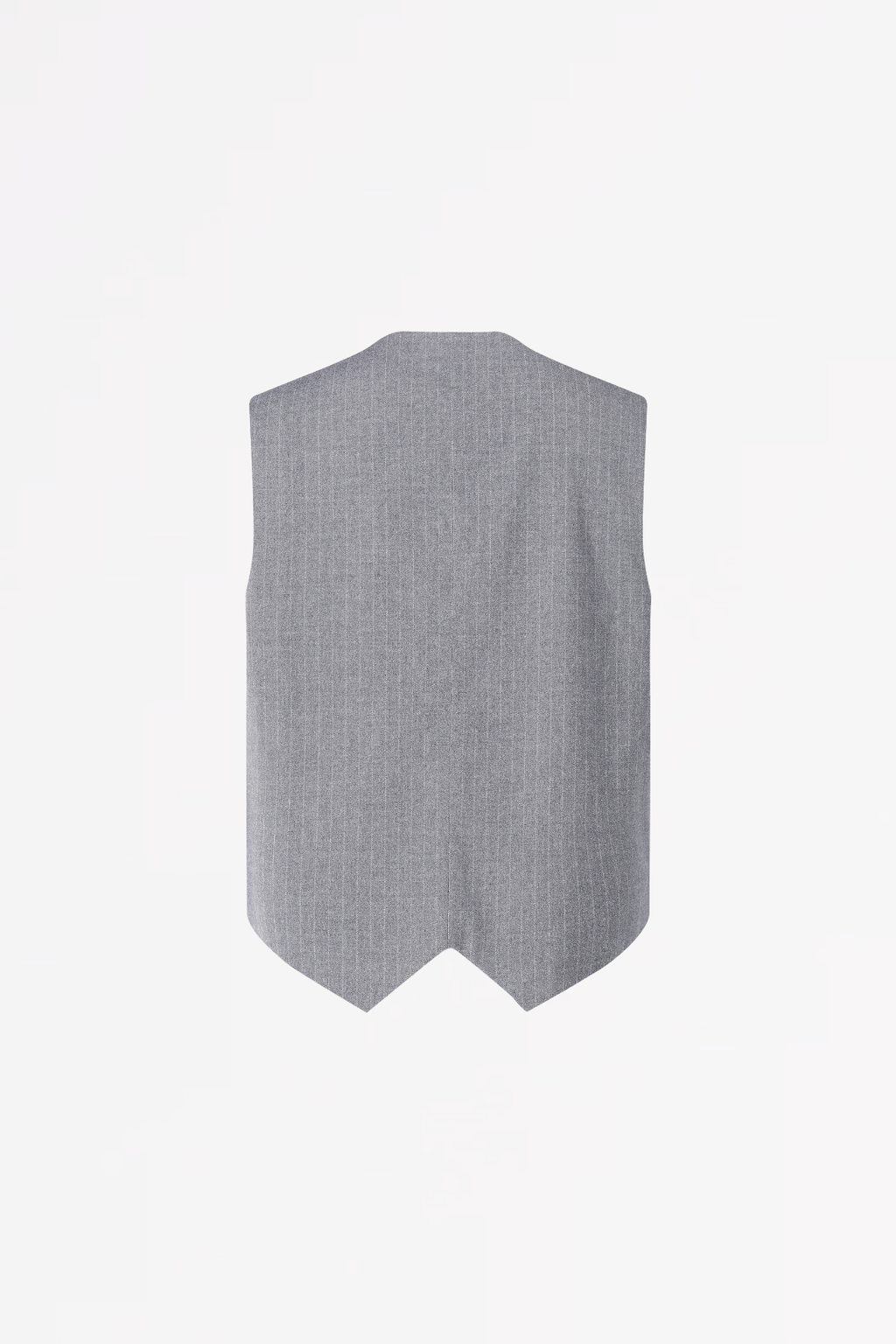 The JEANINE waistcoat reinterprets a tailoring classic with modern ease. Crafted from soft flannel with a subtle pinstripe, it offers a slightly oversized fit that blends comfort with sophistication. The V-neckline and button-front closure create a clean, elongated silhouette, perfect for layering over a crisp shirt or pairing with matching trousers. Elegant yet effortless, JEANINE captures the spirit of relaxed refinement. It's a versatile piece for every occasion.