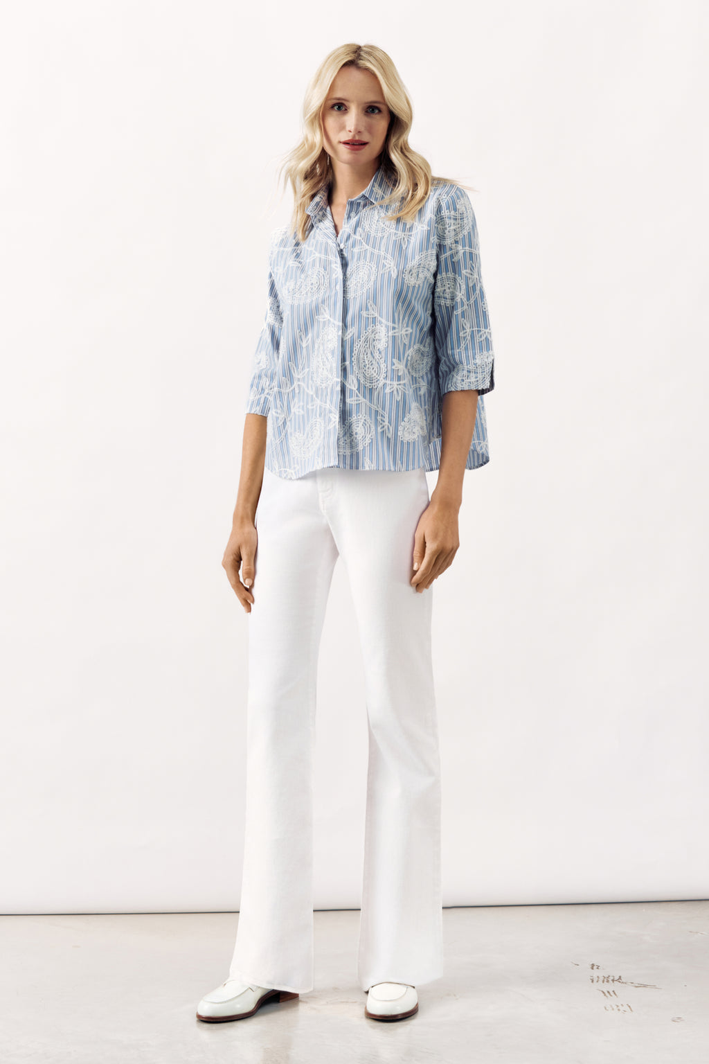 A timeless collar and buttoned front lend structure, while the three-quarter sleeves and gently curved hem enhance the blouse’s effortless, contemporary feel.