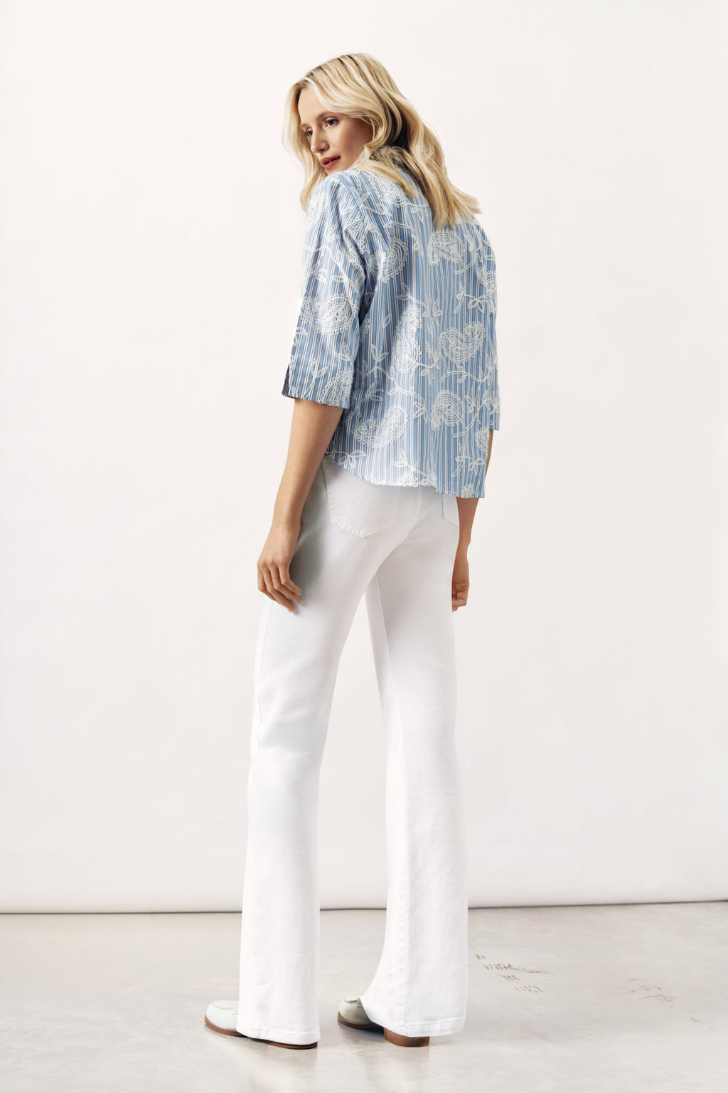 Blouse Ditta combines lightness and refined detailing in a relaxed, feminine silhouette. The pure cotton fabric features a subtle striped structure, enriched with a delicate embroidered print that adds texture and depth without overpowering the design.