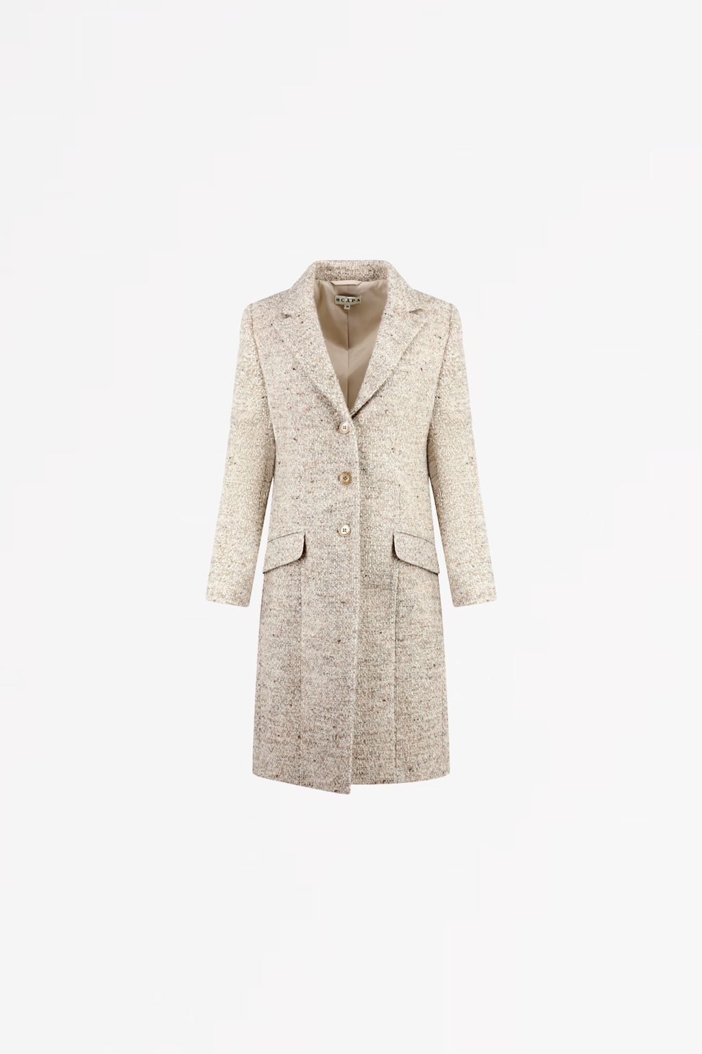 The authentic SCAPA identity, tailored from fine Italian wool. This traditional Margo coat captures the quiet power of tradition, rendered in rich Shetland wool with a heritage tartan woven in earthy tones. The structured silhouette, gently tailored and cut above the knee, balances soft strength with timeless presence. It's a piece that feels both grounded and refined.