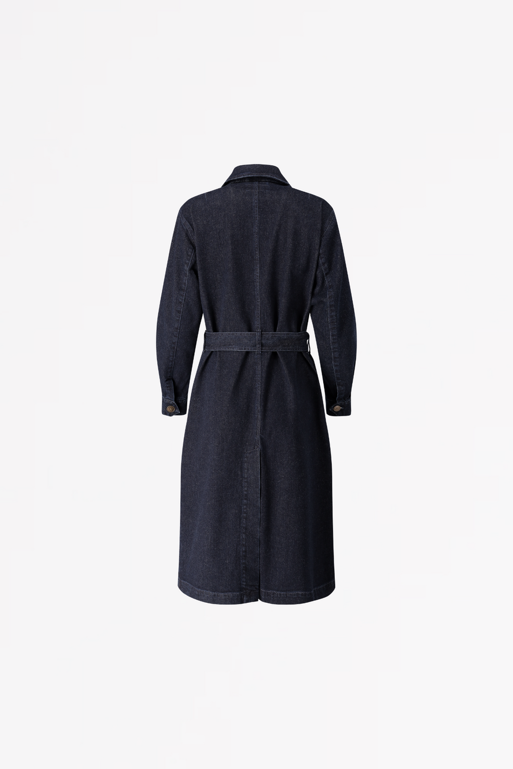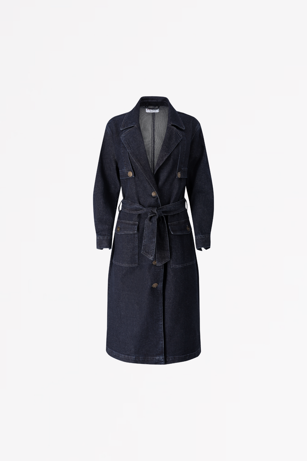 The WANDA coat reimagines the timeless trench with a modern denim attitude. Crafted from stretch denim for comfort and movement, it combines utilitarian edge with refined tailoring. A double-breasted button closure, wide lapels, and removable self-tie belt shape a flattering silhouette, while buttoned cuffs and a mid-calf length complete the look. From city streets to weekend escapes, WANDA is a versatile layer with effortless SCAPA Sport style.
