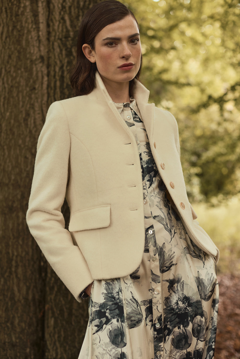 The IVY jacket blends sculpted tailoring with tactile softness. Crafted from a rich wool–alpaca blend, it is cut short and fitted for a contemporary silhouette. The notched lapel, polished button closure and subtle interior details reflect SCAPA’s eye for refinement, turning this compact jacket into a timeless layer for modern dressing.
