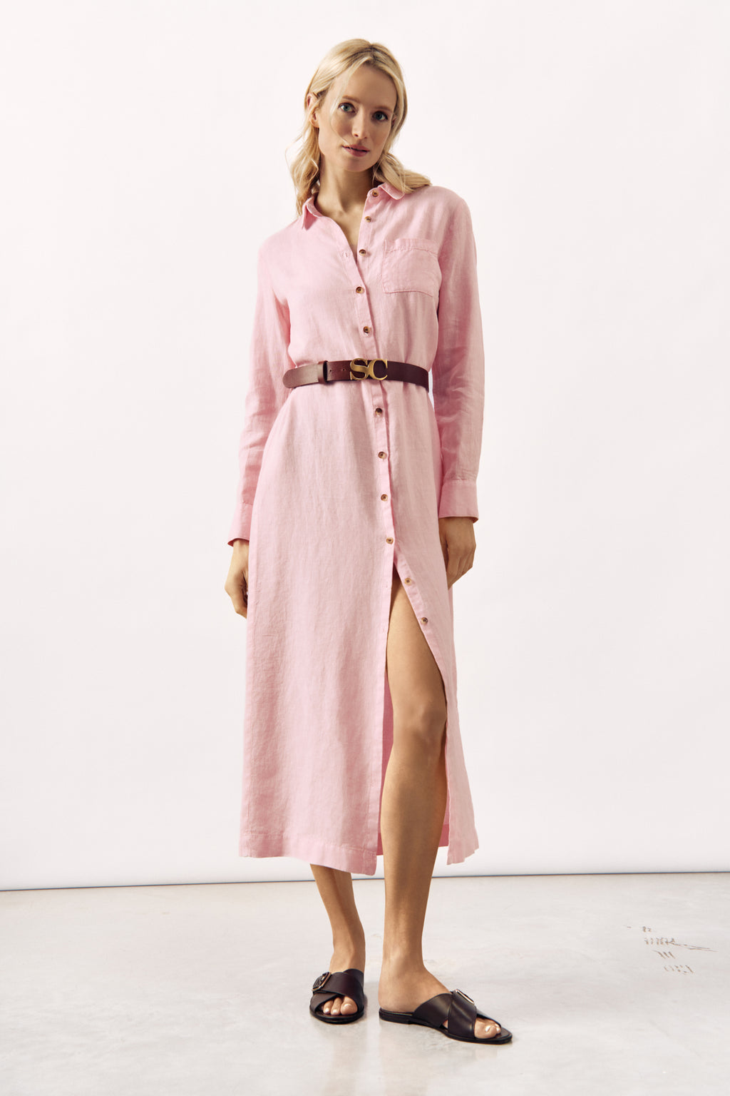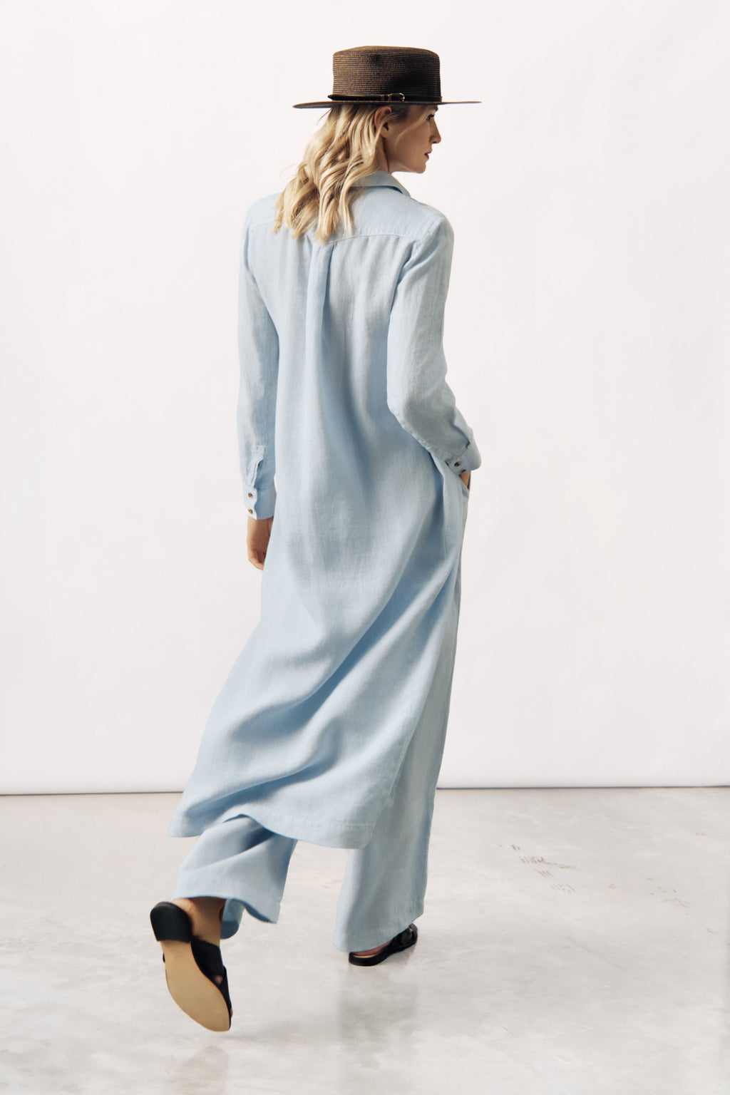 The Brim dress presents a modern interpretation of the classic shirt dress, defined by effortless elegance and natural ease. Crafted from 100% washed linen, it offers a light, breathable feel while the elongated silhouette creates a relaxed yet confident line. A classic shirt collar and full button-through front lend timeless structure, complemented by a chest patch pocket for a subtle contemporary accent.