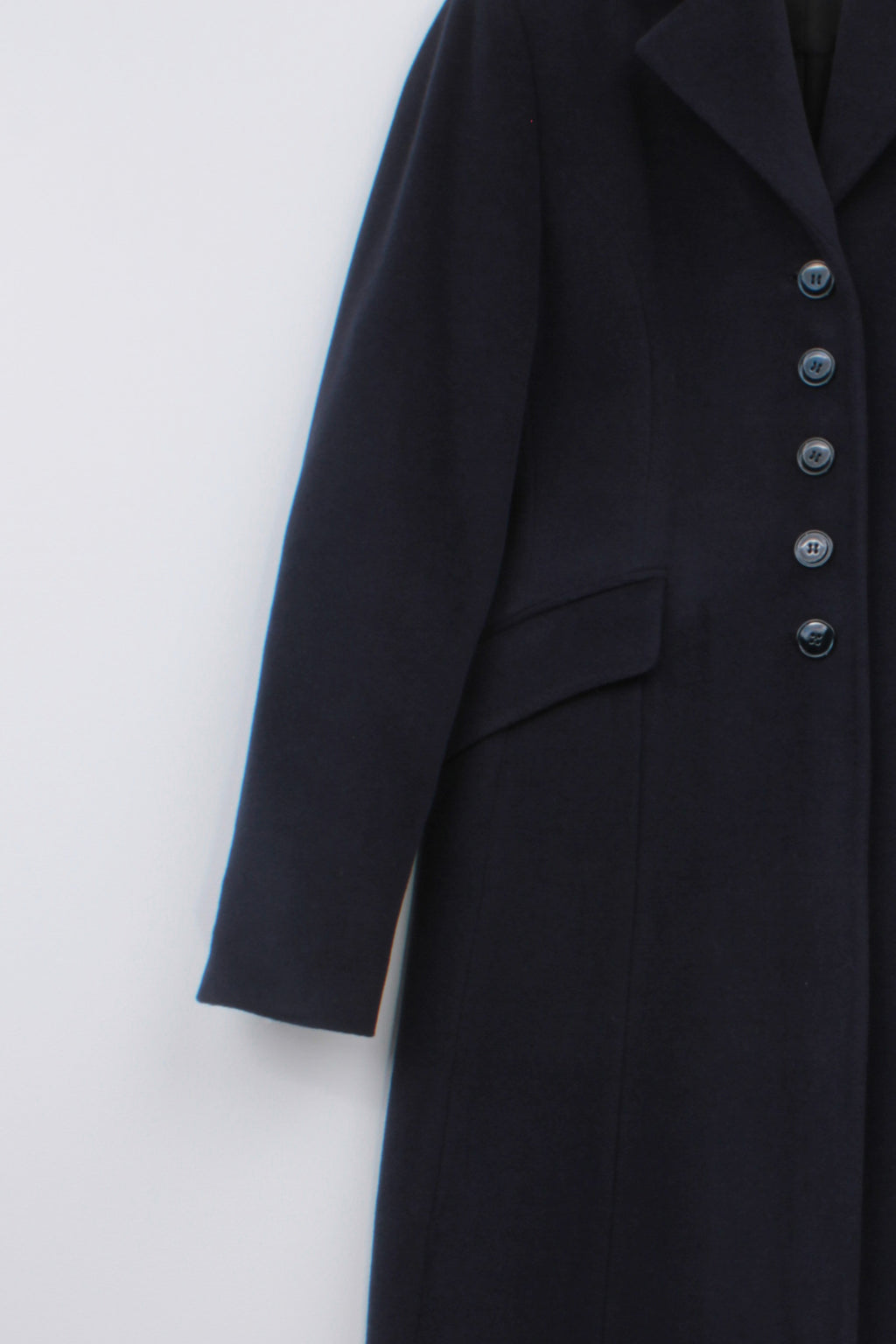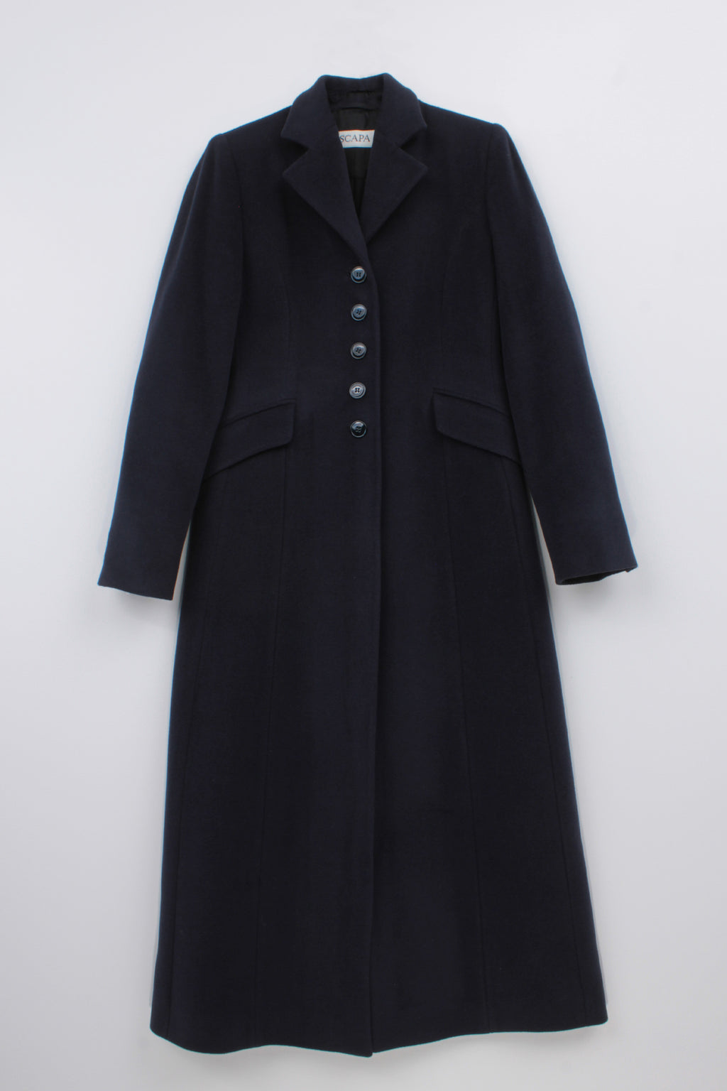 Single-breasted tailored mid-calf coat featuring notched lapel collar, fitted waist, slightly flared bottom, and jetted flap pockets. Allow the soft yet lightweight Angora wool cashmere to keep you warm this upcoming season.