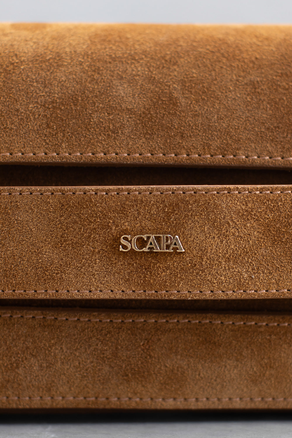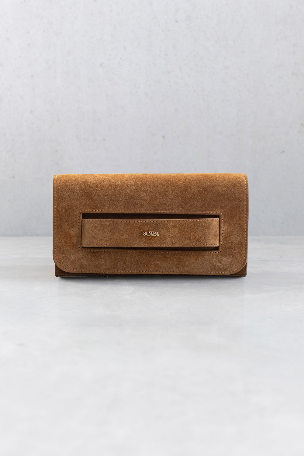 This elegant leather clutch combines timeless design with refined simplicity. Crafted from soft suede leather, the sleek silhouette creates a sophisticated accessory perfect for both daytime and evening occasions. The front detail with subtle SCAPA branding adds a signature touch, while the clean lines and structured shape ensure a polished and versatile look.