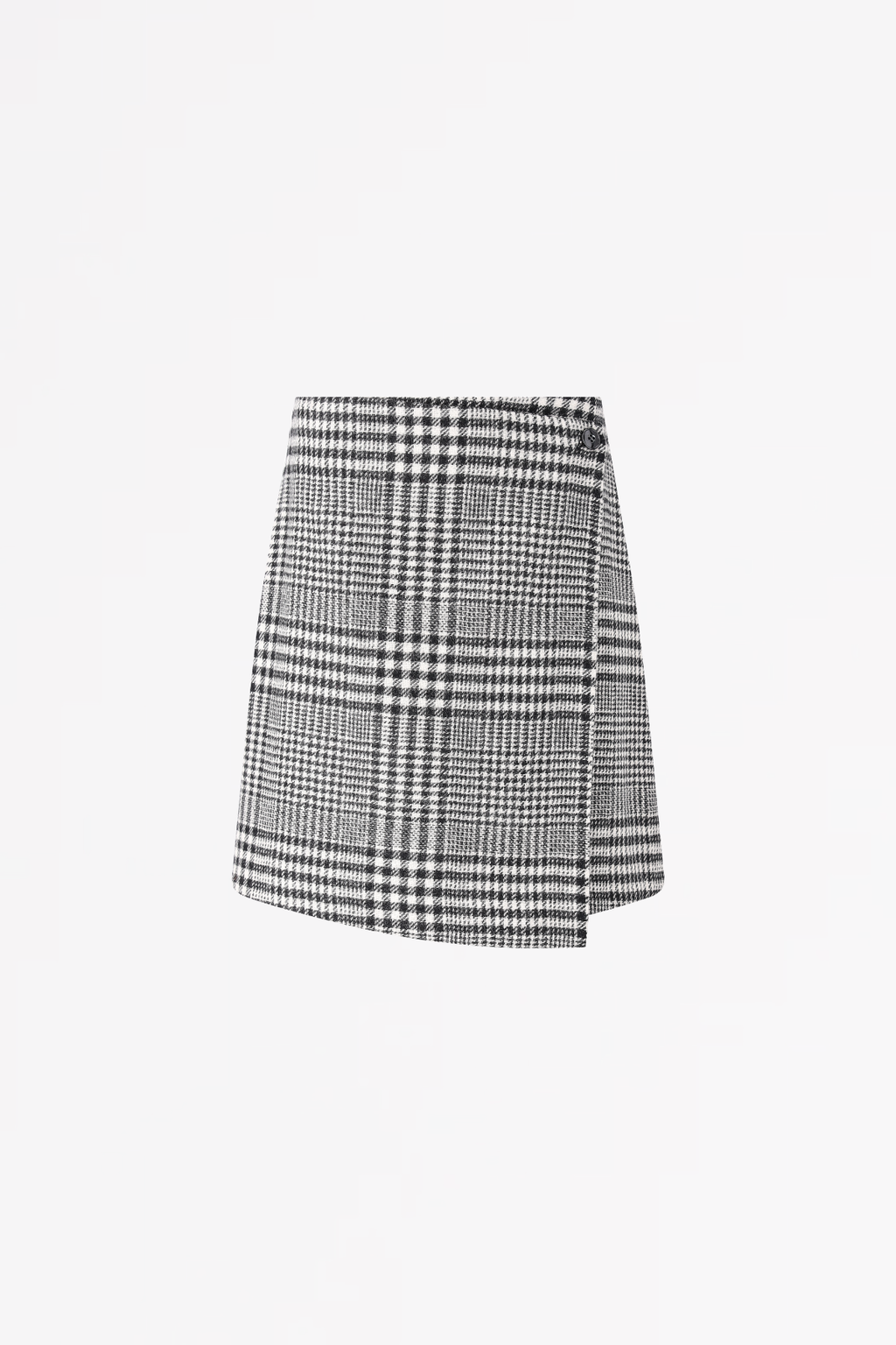 The SILVER skirt offers a contemporary interpretation of timeless tailoring. Crafted from pure virgin wool in a bold black and white plaid, it combines structured elegance with natural ease. The asymmetric front overlap creates subtle movement and modern appeal, while the soft drape of the wool ensures comfort and refinement. Finished with back darts for a flattering shape, SILVER pairs perfectly with the matching blazer or a fine knit for a look that is effortlessly polished and distinctly SCAPA.